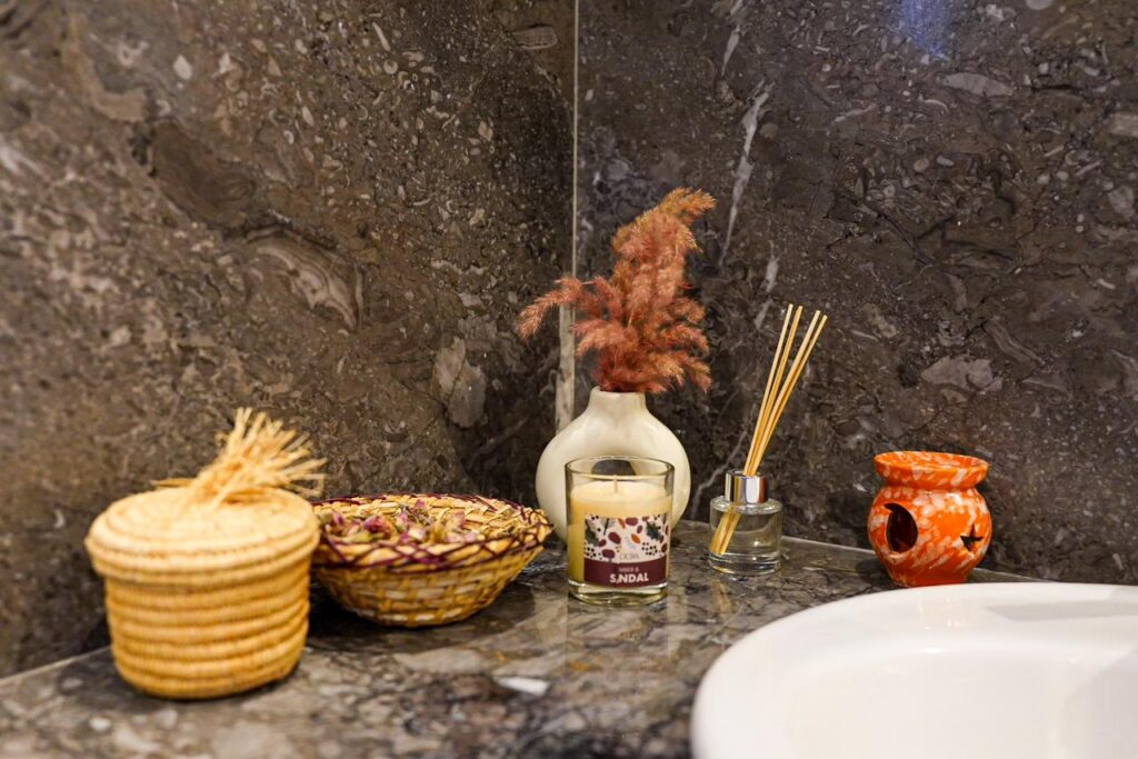 Raw materials, earthy tones, and handcrafted textiles create a soothing atmosphere, perfect for recharging in an elegant and harmonious setting.