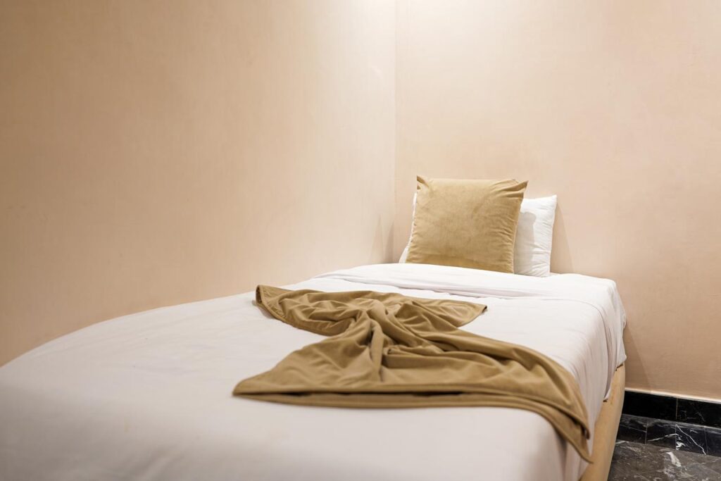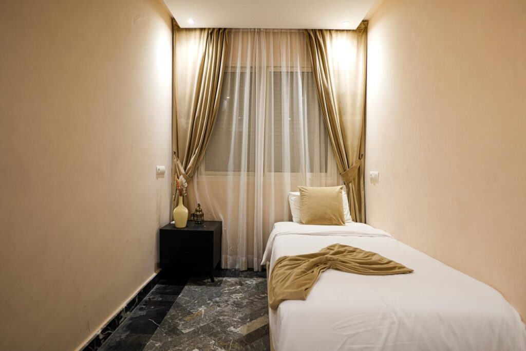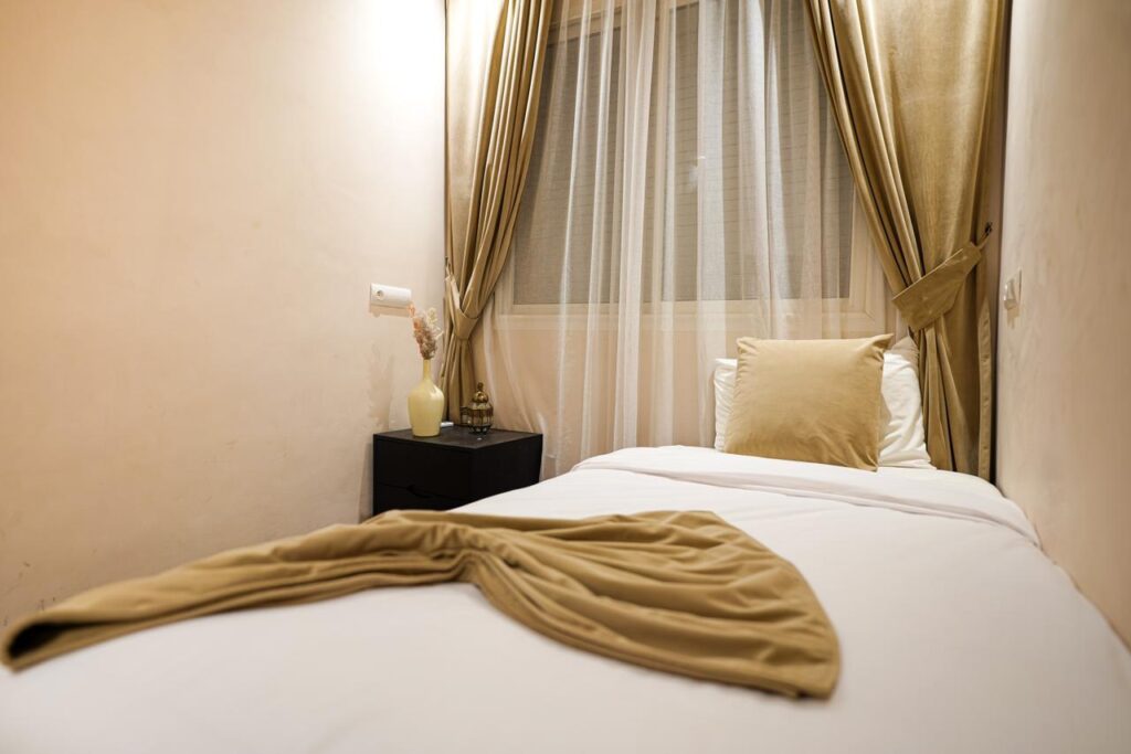 Sandy and earthy tones, natural materials, and soft lighting create a soothing ambiance—perfect for unwinding after a day in Marrakech.
